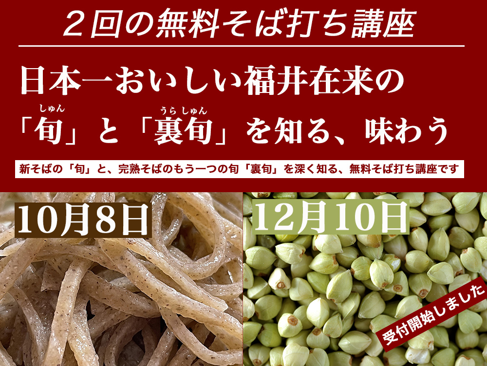 そばの「旬」と「裏旬」の魅力を、食べ比べて楽しんでいただこうというのが、今回の「蕎麦のソムリエ講座」、『日本一おいしい福井在来の「旬」と「裏旬」(うらしゅん)を打つ、味わう』です。10月8日と12月10日の二回に分けて行いますが、福井県のご好意で、二回とも無料講座として開催します。
